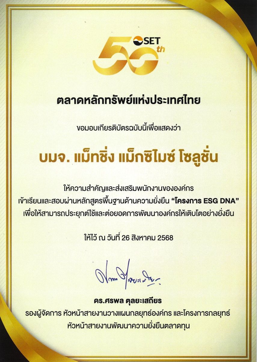 บริษัท แม็ทชิ่ง แม็กซิไมซ์ โซลูชั่น จำกัด (มหาชน) รับมอบเกียรติบัตรใน “ESG DNA” ตอกย้ำความมุ่งมั่นสู่การเติบโตอย่างยั่งยืน